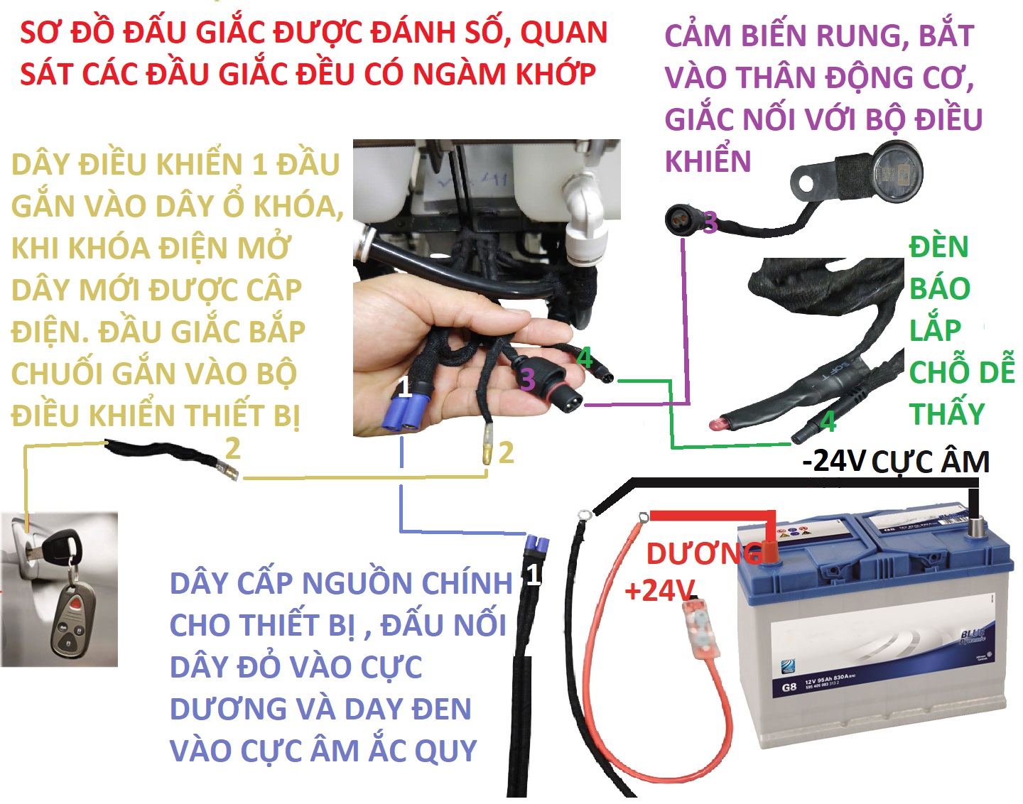 LƯU Ý : ĐỐI VỚI DÂY NGUỒN ĐIỀU KHIỂN CẦN GẮN VÀO DÂY DƯƠNG CỦA CỦA Ổ KHÓA ĐIỆN ,KHI Ổ KHÓA ĐIỆN MỞ THÌ DÂY ĐIỀU KHIỂN MỚI ĐƯỢC CẤP ĐIỆN .